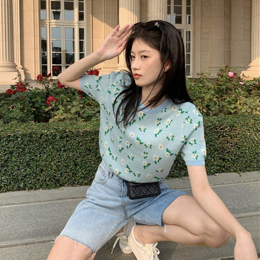 Round Neck Small Floral Knit Short-Sleeved T-ShirtRegular price $25.99 USDRegular priceUnit price / per-